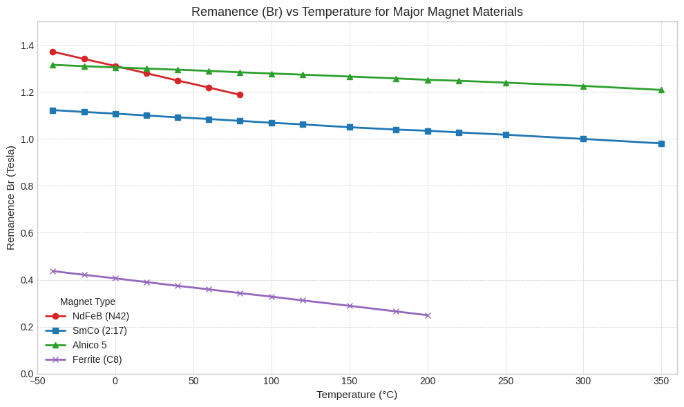 Remanence (Br) vs Temperature for NdFeB, SmCo, Alnico and Ferrite Magnets: Scientific Comparison of Thermal Stability and Magnetic Performance.
